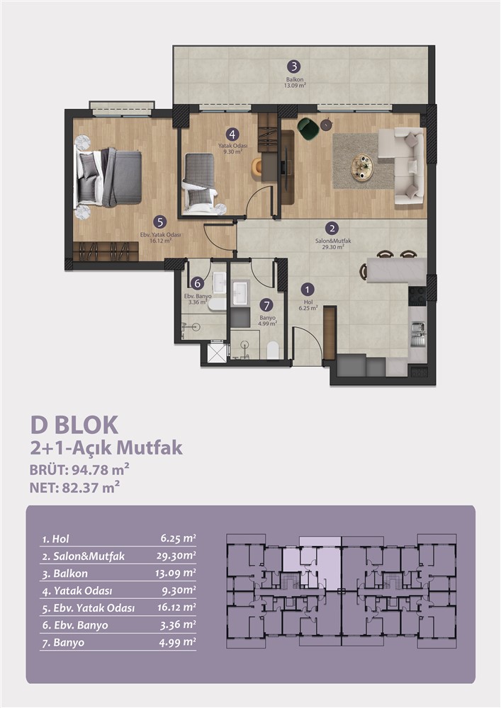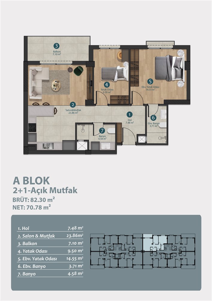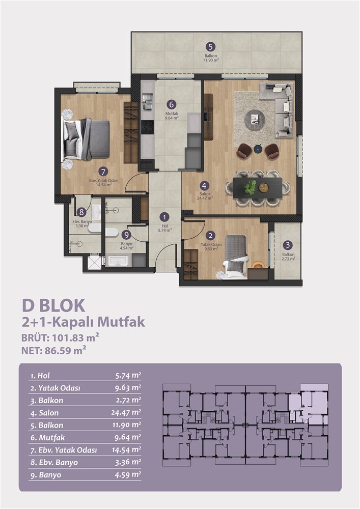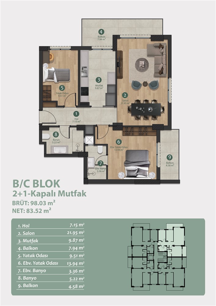 2+1 B & C BLOK Kapalı Mutfak Daire Planı