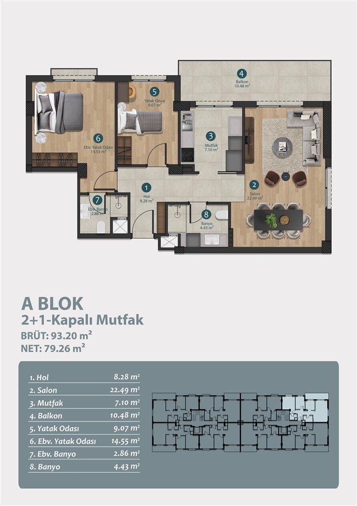 2+1 A BLOK Kapalı Mutfak Daire Planı